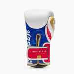 Die Boxhandschuhe Leone Thai Style GN114 sind ein Modell, das für Muay Thai, die Kunst der acht Gliedmaßen, entworfen wurde. Sie sind aus Leder gefertigt und verfügen über einen Klettverschluss, der für optimalen Halt am Handgelenk sorgt, sowie über eine Polsterung, um Tritte und Knie des Gegners abzuwehren. Die Farbkombination dieses Modells erinnert an die Farben der thailändischen Flagge.