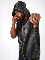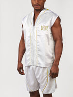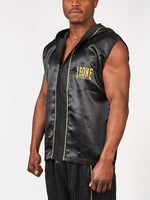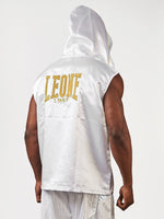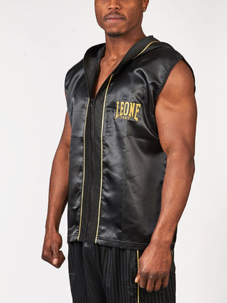 Tragen Sie das Ring Weste Leone Premium und betreten Sie den Ring mit großem Stil. Ideal in Kombination mit den Shorts der Premium-Linie, ist die ärmellose AB261 aus einem Polyester-Satin-Mischgewebe gefertigt, das glänzend und weich auf der Haut ist. Die logo und goldene Details verzieren das Kleidungsstück auf der Vorderseite und der Kapuze und machen es perfekt für Boxer, die Eleganz und Raffinesse lieben.